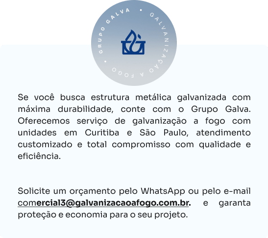 Sim, nossa estrutura permite galvanizar desde pequenas peças até grandes estruturas metálicas para construção civil, industrial ou urbana, com atendimento especializado em Curitiba e São Paulo.